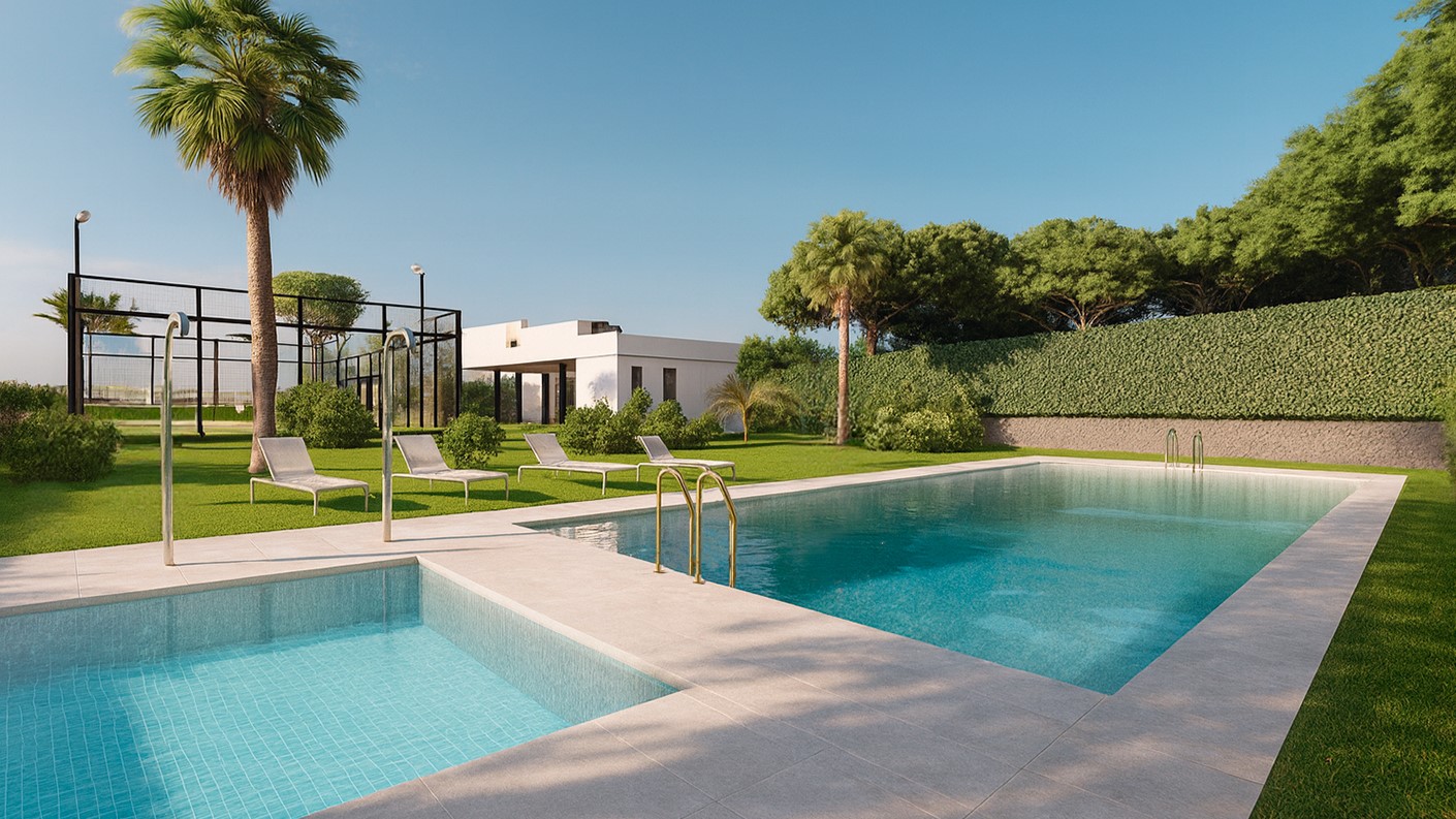 - Zonas Comunes. Para disfrutar individualmente, en familia o con los amigos de la urbanización. Compartir espacios como la piscina, pistas de pádel, jardines y club social es crear momentos únicos que formarán parte de preciosos recuerdos que te acompañarán siempre.